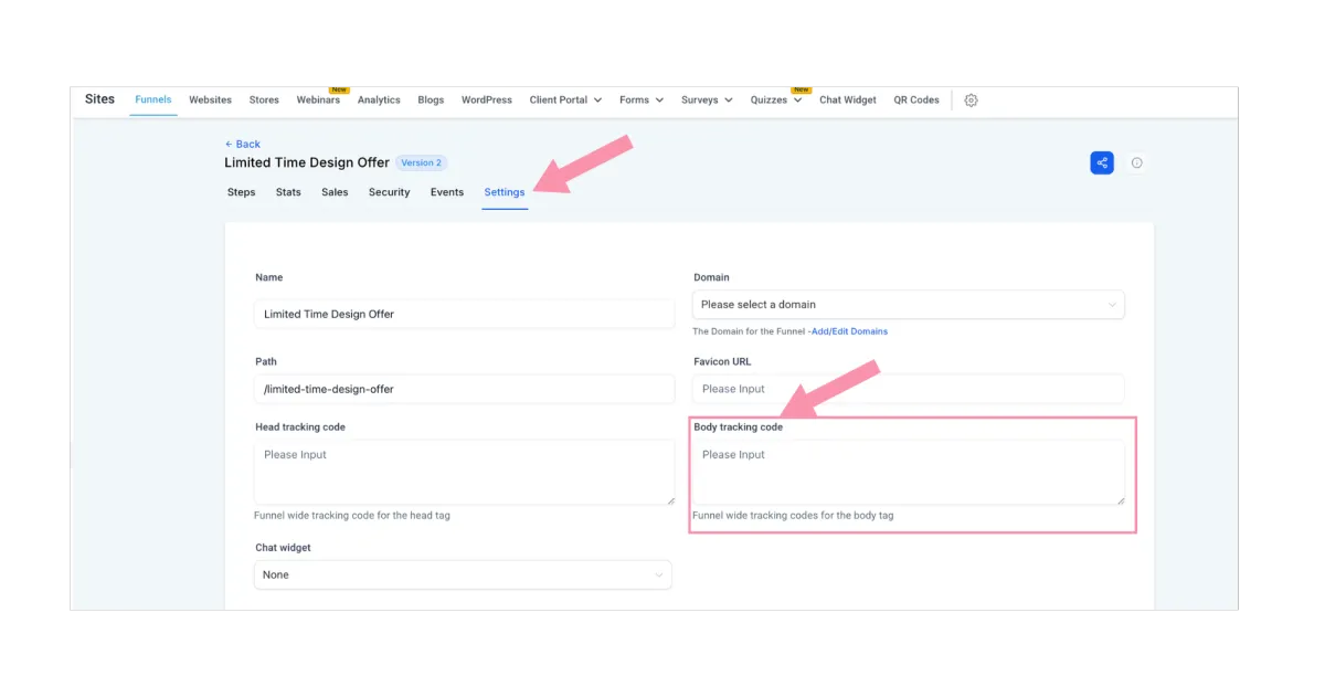 Open any funnel, choose “Settings”, then place in the “body tracking code” field. Alternatively, open the design editor, choose the Settings cog, and again place in the body tracking code tab.